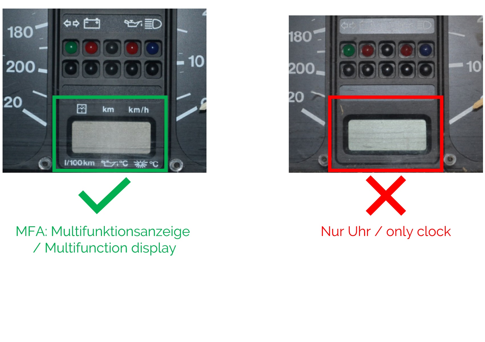 In diesem Angebot erhalten Sie ein Komplettset für die Reparatur der Anzeige Ihrer VW Golf 1 / Golf 2 "MFA" Multifunktionsanzeige. Die MFA wurde auch in anderen Modellen aus der Zeit verwendet, auch hier passt das Display. Nicht jedoch bei den einfachen Digitaluhren, hier ist ein anderes Display erforderlich.
