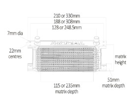 Die Kühler sind in verschiedenen Höhen und zwei Breiten erhältlich: 115 mm Matrix oder 235 mm Matrix, aber nur in einer Breite von 51 mm (von vorne nach hinten). Die Höhe eines Kühlers wird normalerweise in Reihen angegeben. Dies ist die Anzahl der Ölkanäle einschließlich der oberen und unteren Platten, die Öl transportieren.