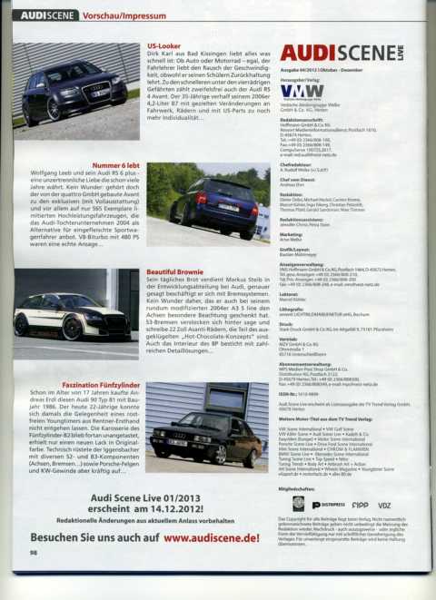 Audi Scene 4/2012 Vorschau der Lspeed RS6 plus und der Audi 90 von Andal in der Audi Scene 1/2013